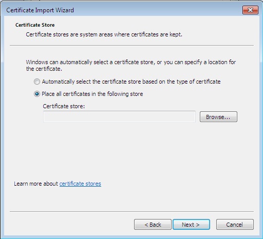 - В следующем окне диалога выбрать пункт Place all certificates in the following store и нажать на кнопку Browse: