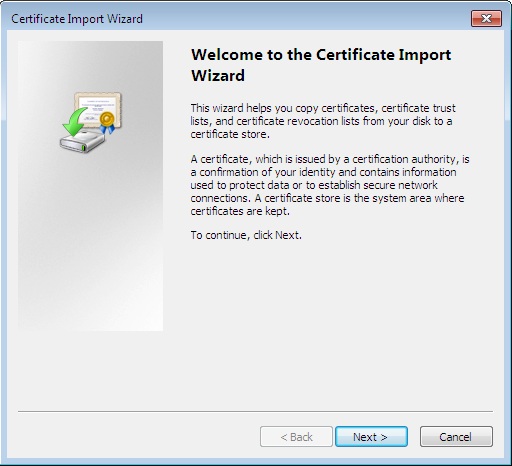 - Открыть файл сертификата или дважды щёлкнуть на нём мышкой, если файл сертификата сохранён на компьютере. После этого откроется окно диалога мастера импорта сертификта.